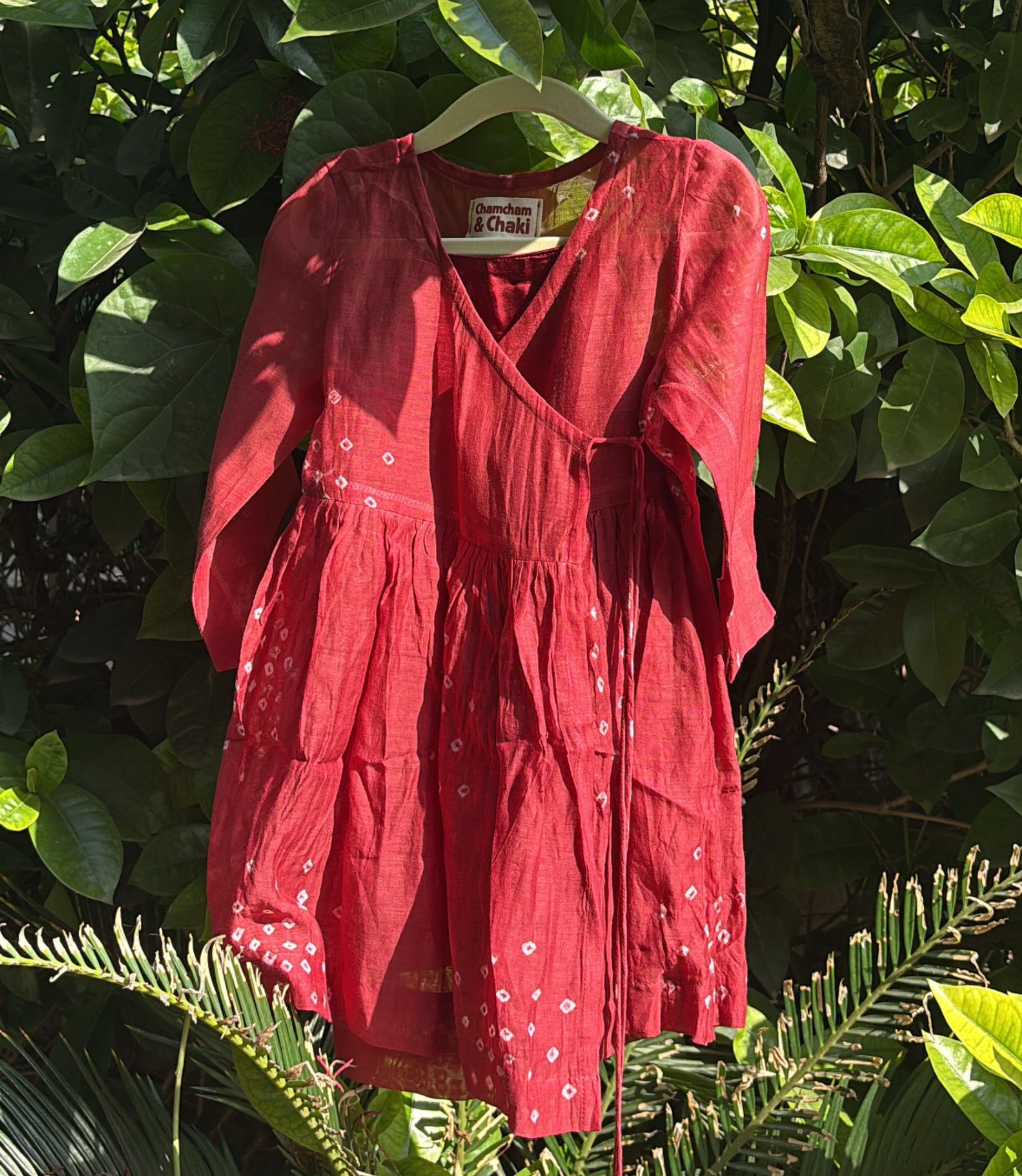 • Details: Wrap-around angrakha style, cluster bandhani pattern, comes with modal spaghetti slip